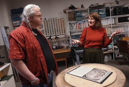 UWEC Professor Erna Kelly in discussion with Eau Claire glass artist Jimmy Hazelton at the second V&W (2002). Photo by Andi Stempniak, Eau Claire Leader-Telegram.